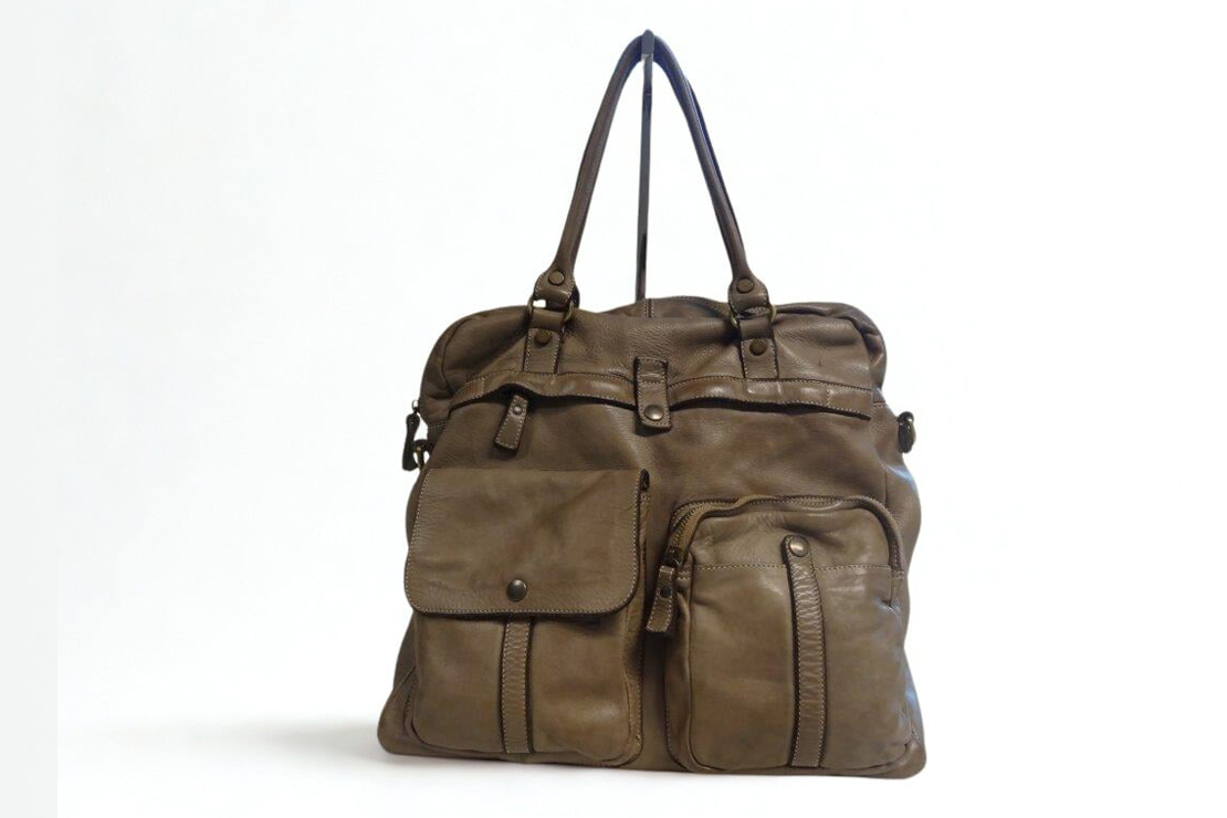 Borsa Raul Fango in vera pelle vacchetta tinta in capo con effetto invecchiato. Pratica, capiente e dallo stile casual chic, ideale per l’uso quotidiano.