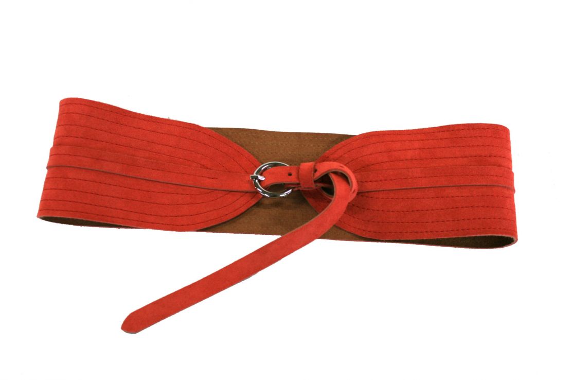 Cintura da donna in crosta scamosciata, con nodo centrale e anello in metallo. Accessorio artigianale, elegante e 100% Made in Italy.