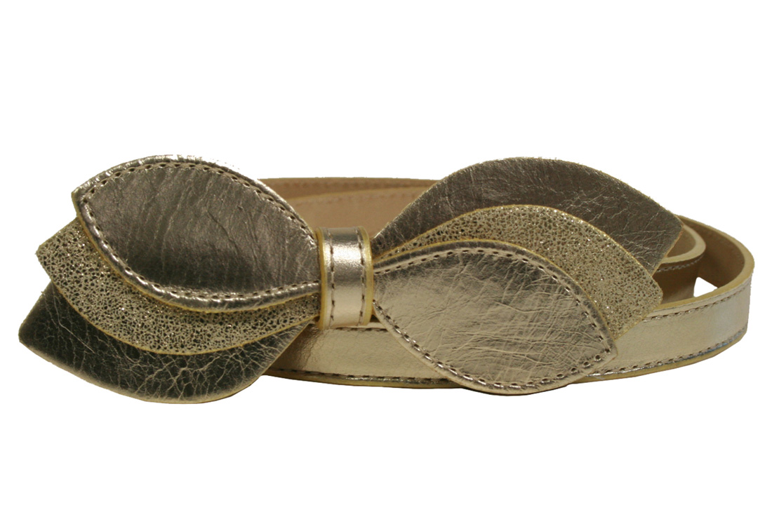 Cintura donna in vera pelle dorata con elegante fiocco a petali sovrapposti. Accessorio glamour e sofisticato, 100% Made in Italy.