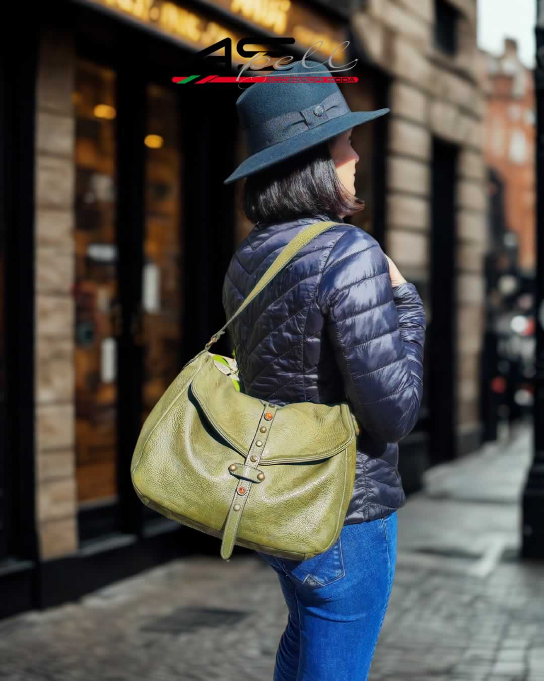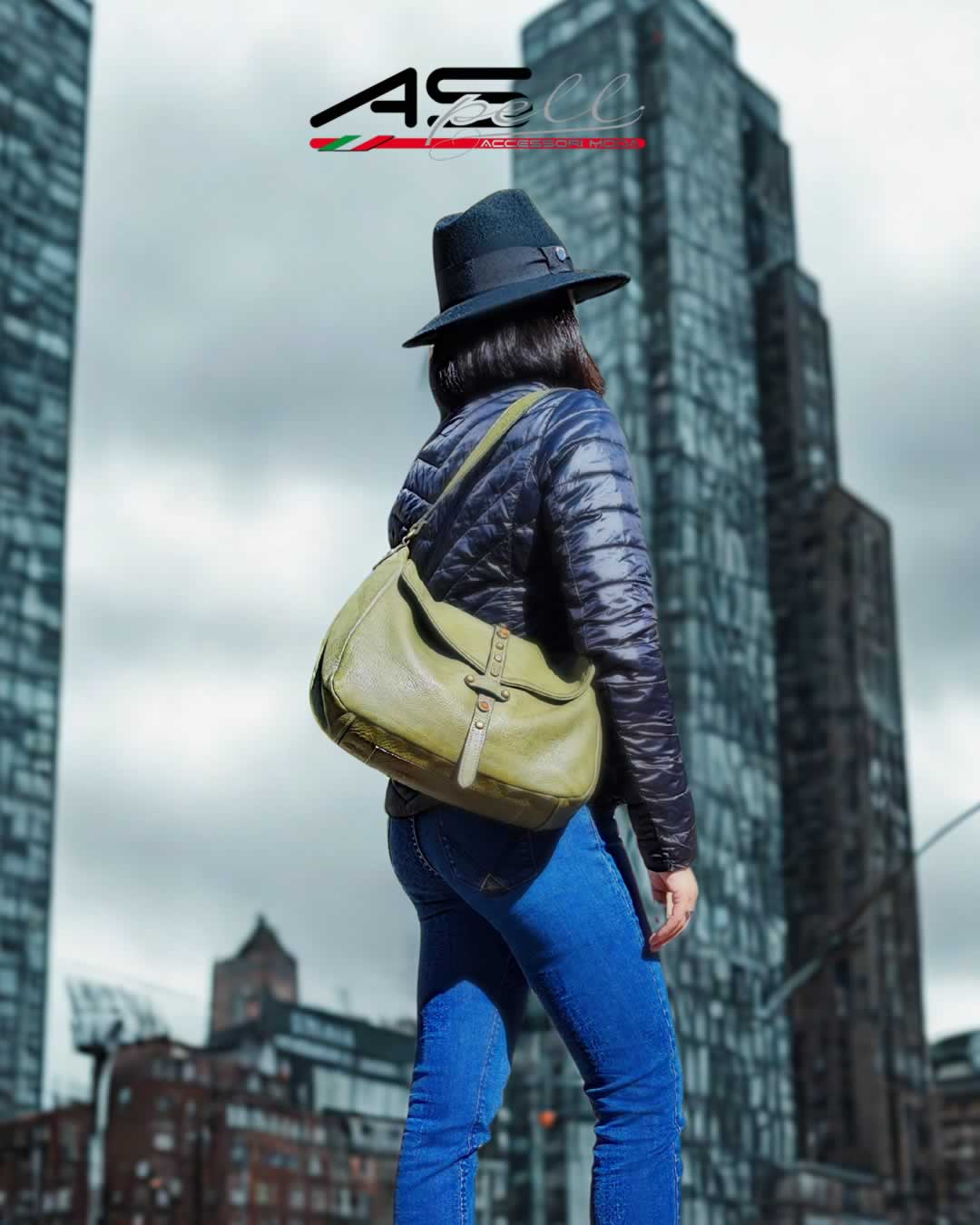 Borsa Enrica Verde in vera pelle vacchetta tinta in capo, caratterizzata da borchie decorative in metallo. Un accessorio elegante e artigianale, 100% Made in Italy.