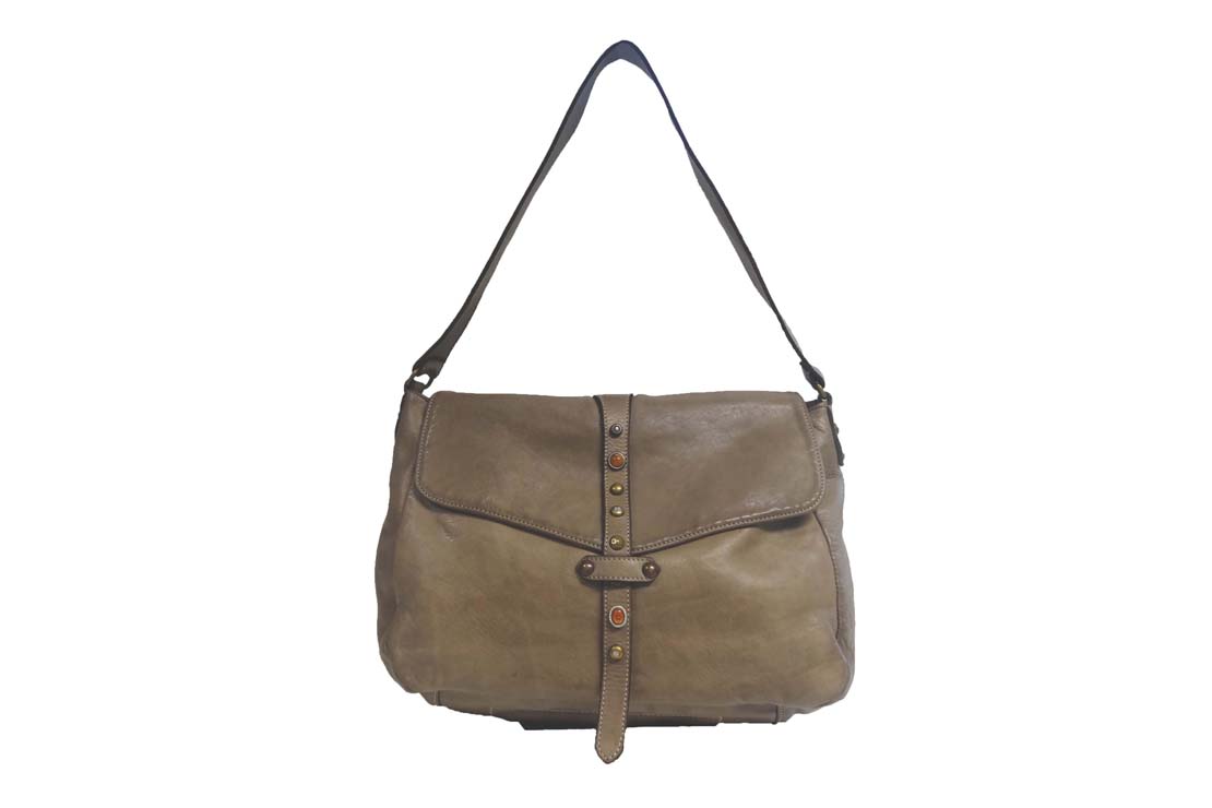 Borsa Enrica Fango in vera pelle vacchetta tinta in capo, con dettagli in metallo e patta decorata. Un modello versatile e artigianale, 100% Made in Italy.
